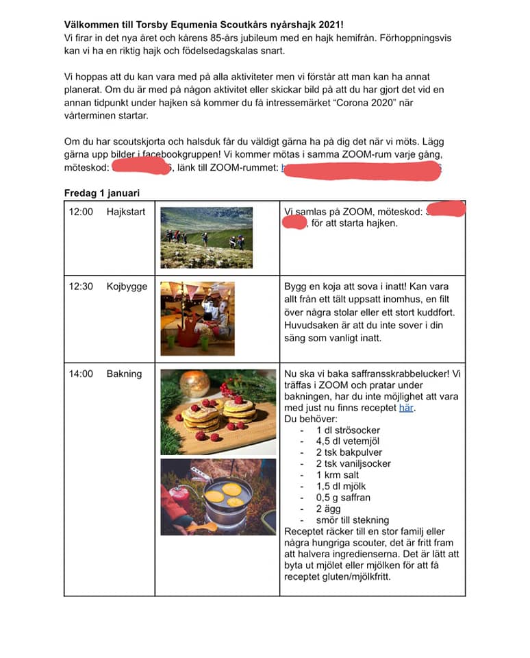 Scouterna får schemat innan och deltar på de delar de kan. Bilagorna är en grund att utgå ifrån men ni kan hitta på helt egna aktiviteter att göra under helgen.